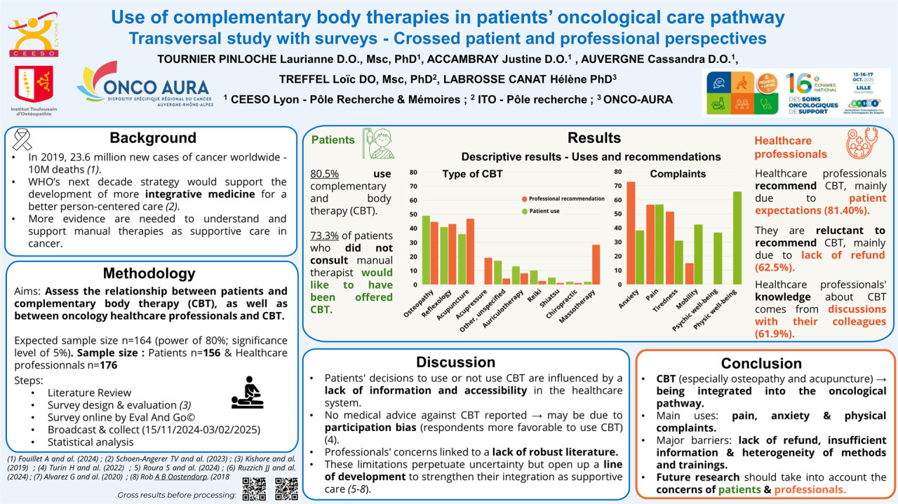 Place et représentations de la thérapie manuelle durant le parcours de soins en oncologie. Regards croisés des patients et des professionnels de santé, enquête nationale par questionnaires (P52)