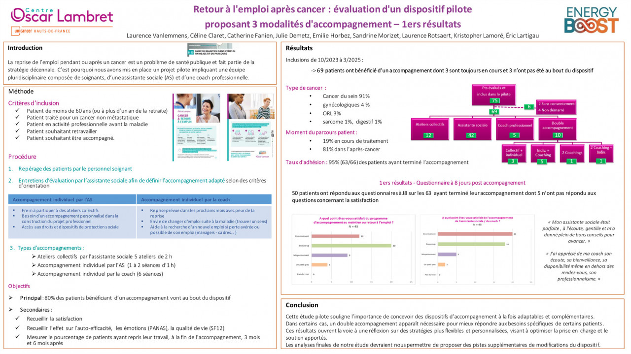 Retour à l'emploi après cancer : évaluation d'un dispositif pilote proposant trois modalités d'accompagnement - premiers résultats.